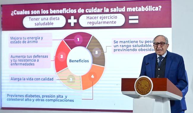 Durante la conferencia matutina: “Las mañaneras del pueblo”, encabezada por la secretaria de Gobernación, Rosa Icela Rodríguez Velázquez, en representación de la Presidenta Claudia Sheinbaum Pardo, el titular de la Secretaría de Salud explicó que la salud metabólica implica el funcionamiento óptimo de los procesos del cuerpo que transforman azúcares, grasas y proteínas en energía.