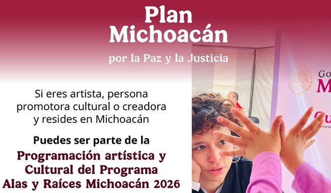 La Secretaría de Cultura del Gobierno de México, a través de la Coordinación Nacional de Desarrollo Cultural Infantil, en concordancia con la Secretaría de Cultura del Gobierno del Estado de Michoacán, a través del programa Alas y Raíces Michoacán, publica la invitación para integrar la Programación Artística y Cultural Alas y Raíces Michoacán 2026.