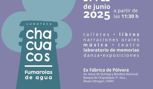 Bajo los principios del ejercicio pleno de los derecho culturales y ambientales, la Secretaría de Cultura del Gobierno de México (a través de la Dirección General de Vinculación Cultural, el Sistema Creación y la Coordinación Nacional de Desarrollo Cultural Infantil – Alas y Raíces), en colaboración con la Secretaría de Medio Ambiente (SEDEMA) del Gobierno de la Ciudad de México, iniciarán las actividades de la Ludoteca “Chacuacos. Fumarolas de agua” el sábado 21 de junio de 2025, la cual beneficiará a la comunidad que habita y visita la zona poniente de la capital del país.