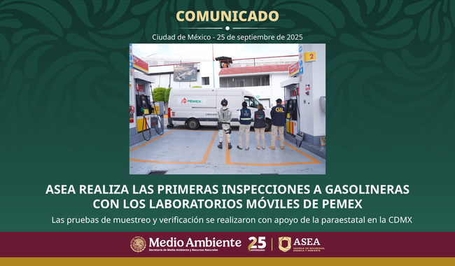 La Agencia de Seguridad, Energía y Ambiente (ASEA) realizó las primeras inspecciones en gasolineras de la Ciudad de México, con el respaldo de los laboratorios móviles de muestreo de Petróleos Mexicanos (PEMEX). El objetivo fue verificar que las estaciones de servicio cumplan con los estándares establecidos en el Acuerdo para el control y monitoreo de emisiones de contaminantes a la atmósfera que deberán observar los Regulados en Estaciones de Servicio con fin específico para expendio al público de gasolinas y/o diésel, publicado en el Diario Oficial de la Federación (DOF) el 17 de julio de 2025.