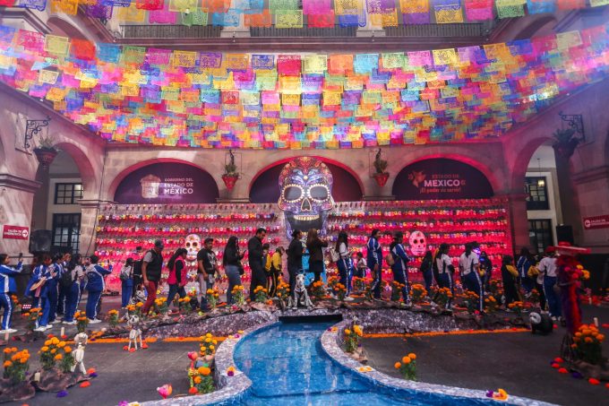 La Ofrenda Monumental fascinó también a un grupo de estudiantes provenientes de Francia, quienes aprovecharon su estancia en México para visitarla, admiraron el “Tzompantli”, un altar decorado con mil calaveras pintadas a mano que honra a los dioses mexicas, destacando la herencia de los pueblos originarios del Estado de México: matlatzinca, mazahua, otomí, tlahuica y nahua.