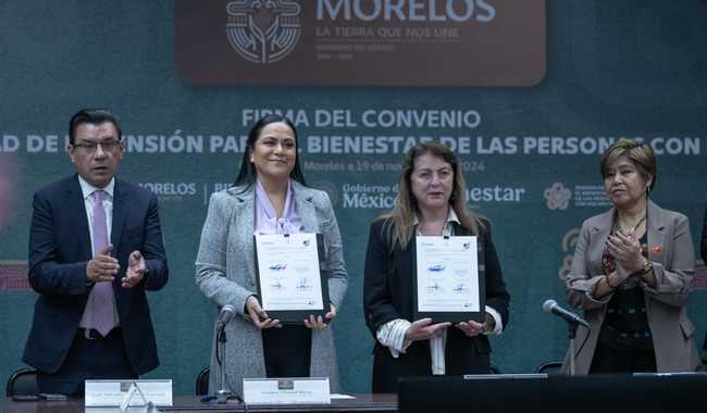 La secretaria de Bienestar, Ariadna Montiel Reyes y la gobernadora de Morelos, Margarita González Saravia, firmaron el Convenio para la Universalidad de la Pensión para el Bienestar de las Personas con Discapacidad, que permitirá ampliar, paulatinamente, el padrón de derechohabientes con aportación económica a partes iguales, lo cual es posible gracias a la suma de esfuerzos entre los gobiernos de México, que encabeza la primera mujer presidenta, Claudia Sheinbaum Pardo y de Morelos.