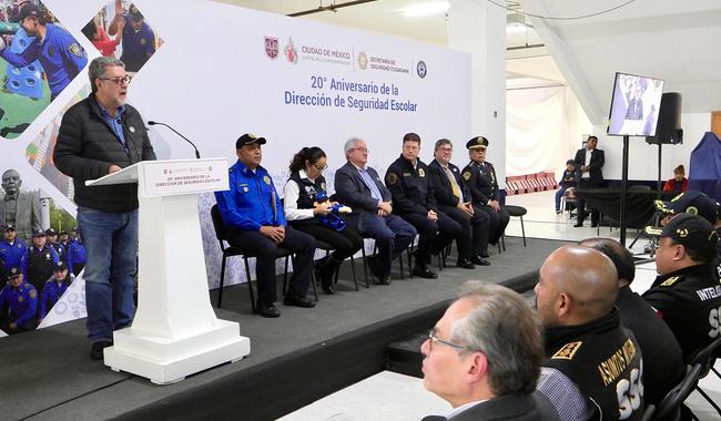 Al participar en la conmemoración del 20º Aniversario de la Dirección de Seguridad Escolar, el titular de la AEFCM reconoció las dos décadas de trabajo de la Secretaría de Seguridad Ciudadana (SSC) de la Ciudad de México para garantizar entornos libres de violencia en los planteles educativos de los tres niveles de enseñanza.
