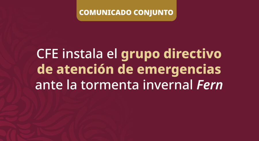 La Comisión Federal de Electricidad (CFE) informa que, en sesión permanente, se instaló el Grupo Directivo de Atención de Emergencias encabezado por la Directora General y su equipo de trabajo con el objetivo de monitorear la evolución de la tormenta invernal “Fern”, fortalecer la coordinación operativa y dar seguimiento oportuno a cualquier afectación que pudiera presentarse, principalmente para las personas usuarias.