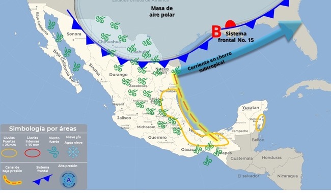 De acuerdo con información del Servicio Meteorológico Nacional (SMN), este miércoles 18 y jueves 19 de diciembre el frente No. 15 se extenderá con características de estacionario sobre la frontera norte de México, se combinará con el ingreso de humedad del Golfo de México, ocasionando lluvias e intervalos de chubascos acompañados de descargas eléctricas, así como vientos fuertes con posibles tolvaneras en el norte y noreste del territorio nacional.