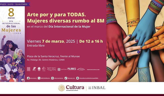 En el marco del Día Internacional de la Mujer, el Museo Nacional de la Estampa (MUNAE), en colaboración con otros espacios culturales, realizarán la jornada Arte por y para todas. Mujeres diversas rumbo al 8M, el viernes 7 de marzo de las 12 a las 16 horas en la Plaza de la Santa Veracruz.
