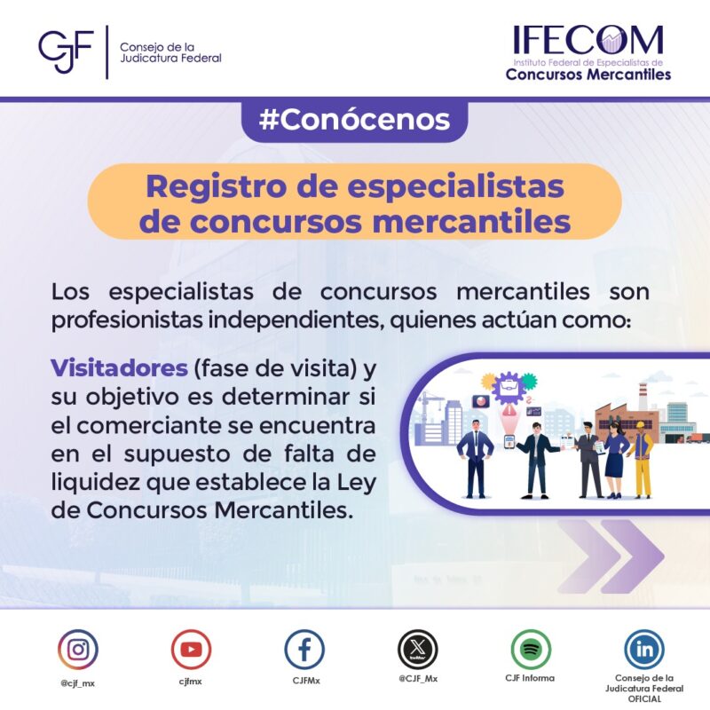 Consejo de la Judicatura FederalInfografías #Conócenos | En el #IFECOM, los especialistas mercantiles se clasifican en visitadores, conciliadores y síndicos. Por Araceli Bastida - junio 16, 2025 0 FacebookTwitterPinterestLinkedinReddItEmailWhatsAppTelegramVK
