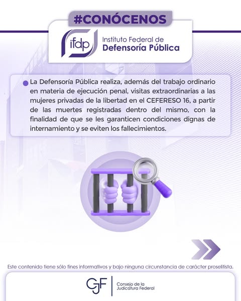 Consejo de la Judicatura FederalInfografías #Conócenos | La Defensoría Pública lleva a cabo acciones jurídicas y de acompañamiento en favor de mujeres del CEFERESO 16 que enfrentan problemas de salud física y mental. Por Araceli Bastida - mayo 21, 2025 0 FacebookTwitterPinterestLinkedinReddItEmailWhatsAppTelegramVK