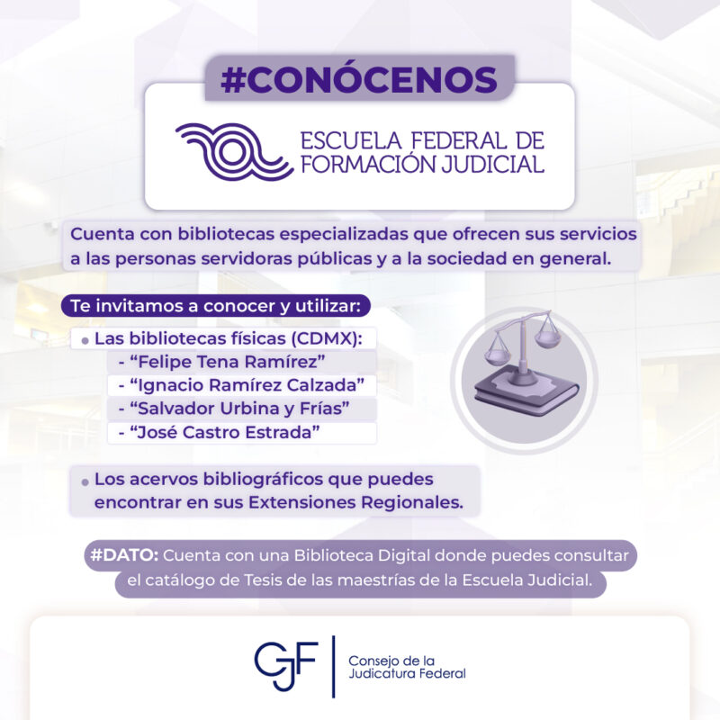 Consejo de la Judicatura FederalInfografías #Conócenos | La Escuela Federal de Formación Judicial pone a tu alcance una gran variedad de libros, revistas y materiales especializados. Por Araceli Bastida - junio 23, 2025 0 FacebookTwitterPinterestLinkedinReddItEmailWhatsAppTelegramVK