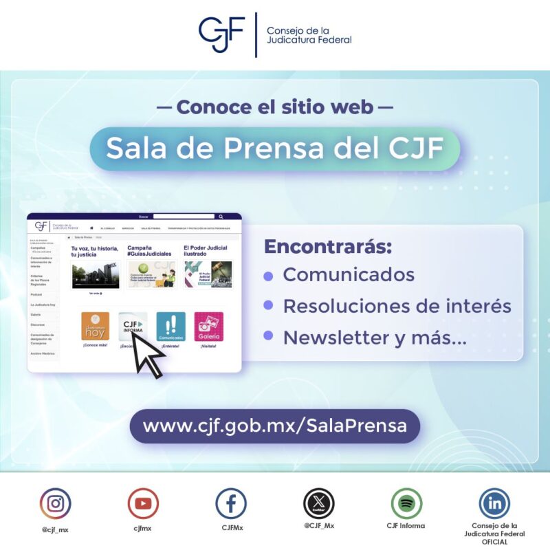 Consejo de la Judicatura FederalInfografías ¿Conoces las #SalaDePrensa del #CJF? Aquí encuentras toda la información periodística y editorial que necesitas saber sobre la #JusticiaFederal. Por Araceli Bastida - marzo 24, 2025 0 FacebookTwitterPinterestLinkedinReddItEmailWhatsAppTelegramVK