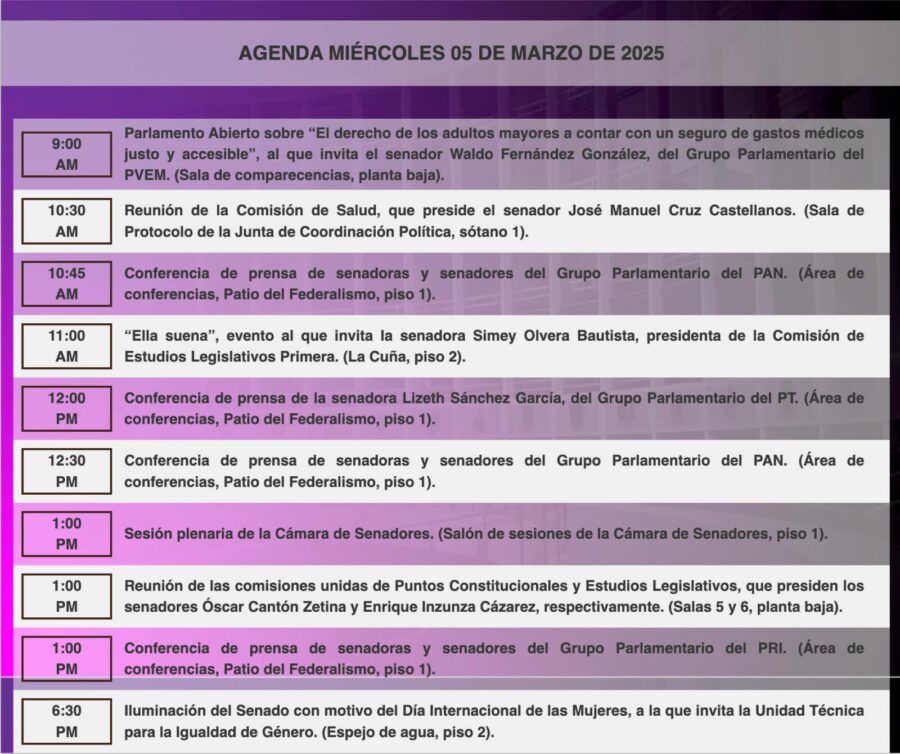 Senado de la RepublicaInfografías Consulta la agenda de #HoyEnElSenado. Por Araceli Bastida - marzo 5, 2025 0 FacebookTwitterPinterestLinkedinReddItEmailWhatsAppTelegramVK