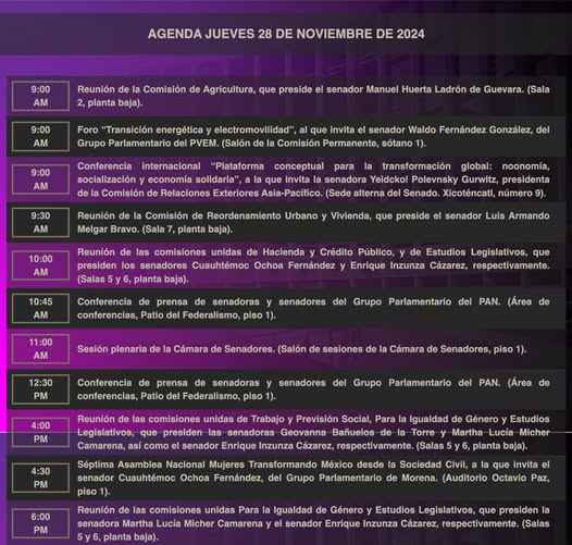 Senado de la RepublicaInfografías Consulta la agenda de #HoyEnElSenado. Por Araceli Bastida - noviembre 28, 2024 0 FacebookTwitterPinterestLinkedinReddItEmailWhatsAppTelegramVK