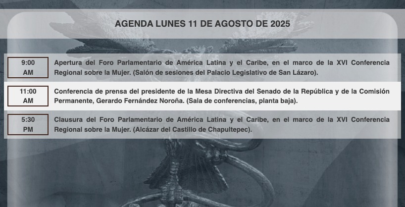 Senado de la RepublicaInfografías Consulta la agenda de #HoyEnElSenado. Por Araceli Bastida - agosto 11, 2025 0 FacebookTwitterPinterestLinkedinReddItEmailWhatsAppTelegramVK