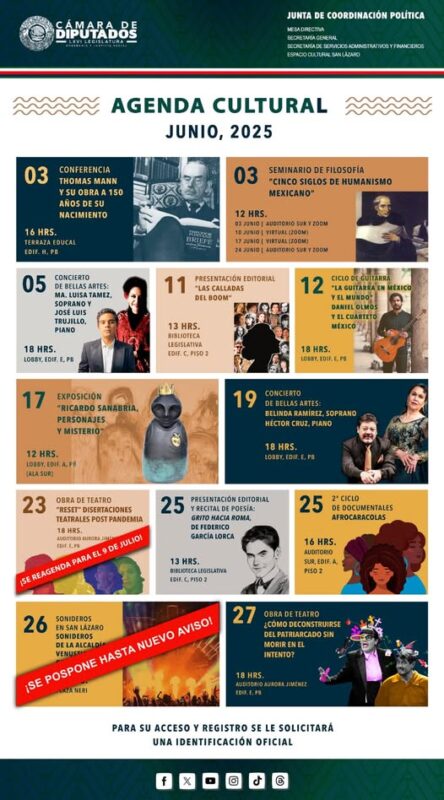 ¡Consulta la cartelera cultural de la Cámara de Diputados! Durante junio, disfruta de conciertos, obras de teatro, y mucho más. Las actividades son gratuitas.
