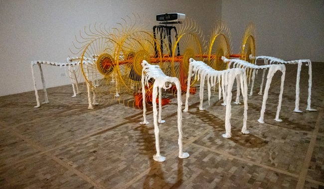 La tercera instalación, ubicada en la Sala 5 del museo, es un audiovisual que da cuenta de un puerto holandés contaminado con barro y aceite de barcos. El video, reeditado para esta ocasión, se tomó con un dron que retrata en primer plano el esqueleto de un animal al centro, como una acusación de la explotación medioambiental. El proyector está rodeado de siete rastrillos cosechadores, expuestos fuera de su función tradicional.
