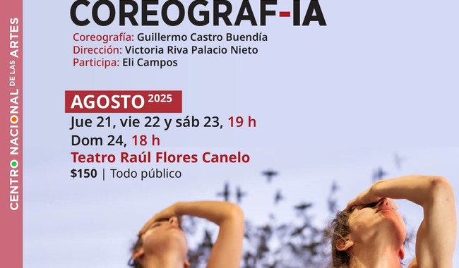 Coreograf-IA se presentará en el Teatro Raúl Flores Canelo del 21 al 24 de agosto, con funciones jueves, viernes y sábado, a las 19:00 h; y domingo, a las 18:00 h. Los boletos tienen un costo de 150 pesos. Para más información consulta la página cenart.gob.mx.