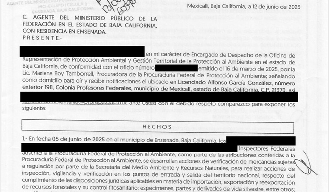 Por la probable comisión del delito contra la biodiversidad, la Procuraduría Federal de Protección al Ambiente presentó una denuncia penal contra quien resulte responsable por el intento de exportar ilegalmente 2,433 kilogramos de aletas de tiburón de especies protegidas, hecho descubierto y documentado los días 5 y 6 de junio en una acción coordinada entre la Secretaría de Marina y la Profepa.