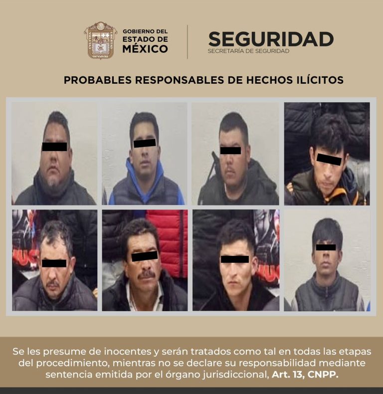 Tras implementar un dispositivo de seguridad, se logró dar con el paradero de los probables responsables, por lo que fueron detenidos por delito flagrante diverso Jesús “N” de 24 años, Pablo “N” de 39 años, Abimael “N” de 43 años, José “N” de 20 años, Erick “N” de 25 años, Daniel “N” de 19, Emiliano “N” de 53, Alejandro “N” de 23 y un menor de 17 años de edad.