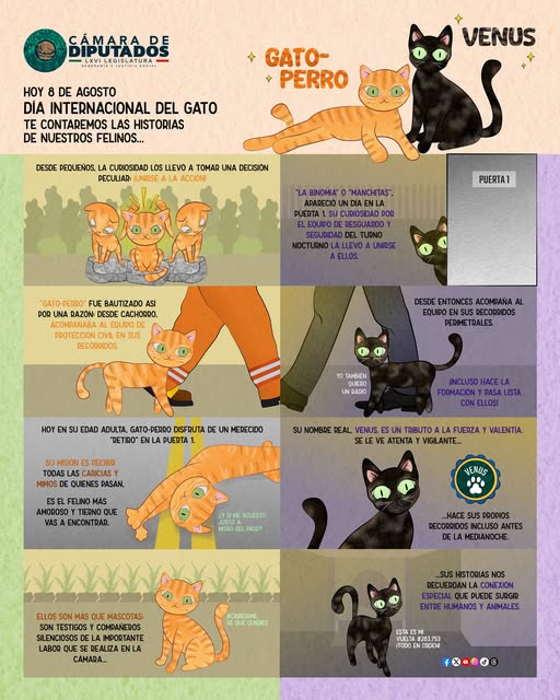 #DíaInternacionalDelGato | Entre debates y reformas, dos pequeños corazones felinos laten fuerte en la Cámara de Diputados. Perro-Gato, el travieso excompañero de Protección Civil. 🐈⬛ Venus, la silenciosa guardiana de las noches. No son solo gatos: son memoria viva, ternura y alma de este recinto.