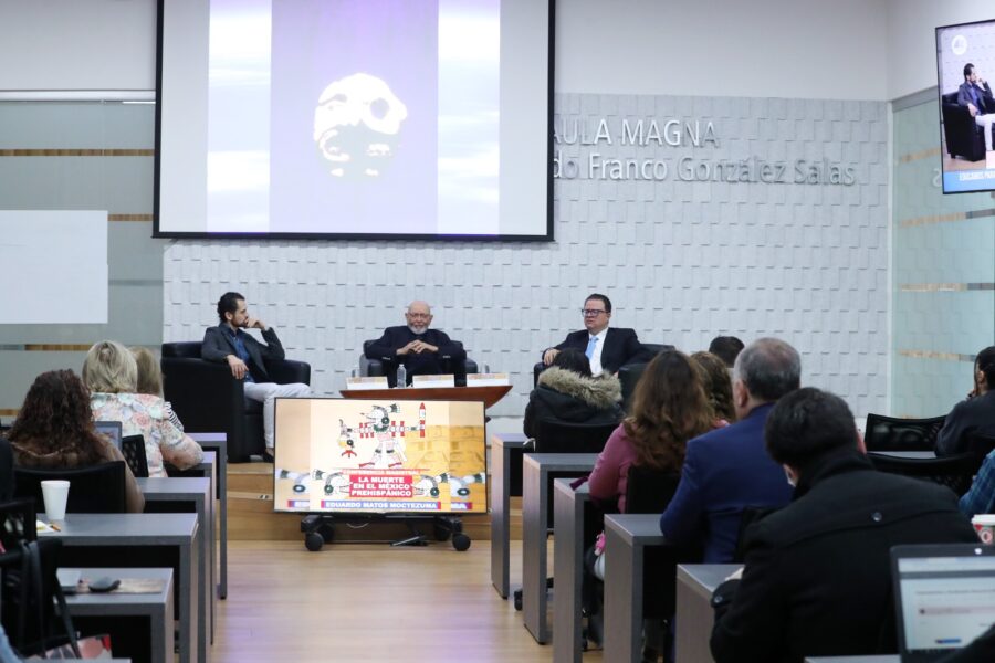 Matos Moctezuma platicó sobre el pensamiento de la muerte y las prácticas mortuorias entre diversos pueblos, como los mexicas, mayas, zapotecas, mixtecas y otras culturas, a partir de la revisión de entierros encontrados en los diversos sitios arqueológicos, donde el miedo a morir y la búsqueda de trascender marcaron la visión de la muerte en la época prehispánica.