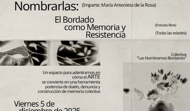 “Nombrarlas: el bordado como memoria y resistencia” es la charla que ofrecerá la artista María Antonieta de la Rosa en La Tallera, espacio del Instituto Nacional de Bellas Artes y Literatura (INBAL) ubicado en Cuernavaca, Morelos. La actividad se realiza en el contexto de la exposición “Nombrarlas”, que actualmente se exhibe en el Centro Cultural Jardín Borda de esta misma ciudad.
