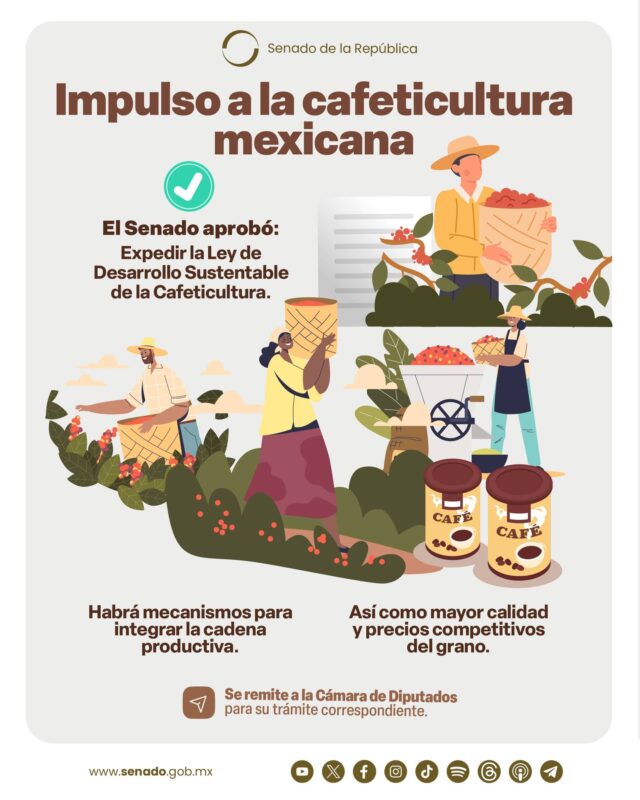 El café es identidad, cultura y patrimonio. La Ley de Desarrollo Sustentable de la Cafeticultura aprobada en el Senado, busca combatir abusos en el mercado y justicia para quienes lo cultivan, así como proteger a comunidades productoras.