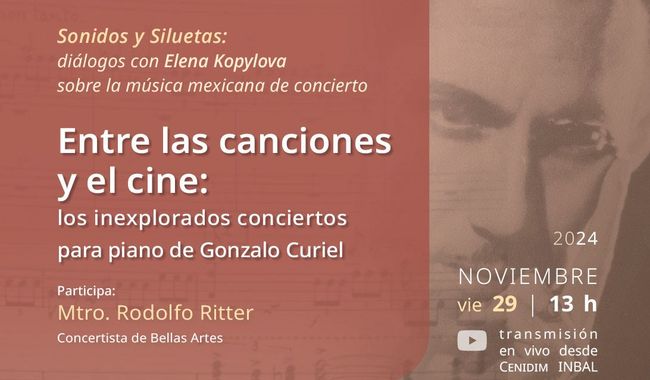 Estas actividades constituyen una propuesta que incluye el análisis de varios géneros musicales a lo largo de la historia del arte sonoro de México; en esta segunda presentación, bajo el título “Entre las canciones y el cine: descubriendo los inexplorados conciertos para piano de Gonzalo Curiel”, participa el pianista Rodolfo Ritter.
