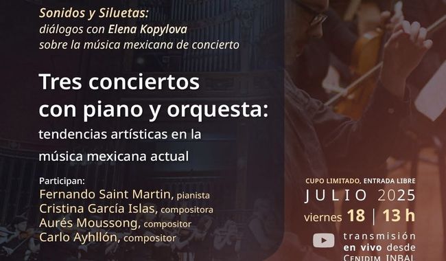 El Centro Nacional de Investigación, Documentación e Información Musical Carlos Chávez (CENIDIM), adscrito a la Subdirección General de Educación e Investigación Artísticas (SGEIA) del Instituto Nacional de Bellas Artes y Literatura (INBAL), invita a la charla Tres conciertos con piano y orquesta: tendencias artísticas en la música mexicana actual, que se transmitirá a través del canal de YouTube del CENIDIM el próximo 18 de julio a las 13 horas.