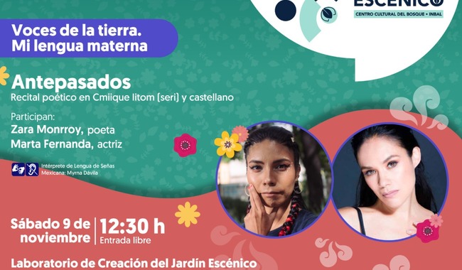 En la cuarta lectura de este ciclo llevado a cabo en el Jardín Escénico, se contará con la participación de la poeta Zara Monrroy y de la actriz Marta Fernanda, con un recital poético titulado Antepasados, que será leído en cmiique iitom (seri) y español.