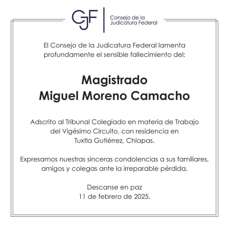 Consejo de la Judicatura FederalInfografías El Consejo de la Judicatura Federal lamenta el sensible fallecimiento del Magistrado Miguel Moreno Camacho. Por Araceli Bastida - febrero 11, 2025 0 FacebookTwitterPinterestLinkedinReddItEmailWhatsAppTelegramVK