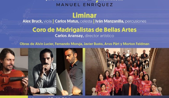 La Secretaría de Cultura del Gobierno de México y el Instituto Nacional de Bellas Artes y Literatura (INBAL), a través de la Coordinación Nacional de Música y Ópera, presenta al Coro de Madrigalistas de Bellas Artes, junto con el ensamble Liminar, como parte de la edición 46 del Foro Internacional de Música Nueva Manuel Enríquez (FIMNME).