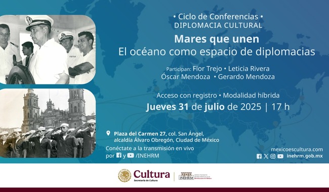 El encuentro de expertos en cultura marítima se llevará a cabo el jueves 31 de julio a las 17:00 horas en formato híbrido: presencial, en la sede central del INEHRM (Plaza del Carmen 27, San Ángel, CP 01000, Álvaro Obregón), y será transmitido en directo por Facebook (/inehrm.fanpage) y YouTube (/Canal INEHRM).