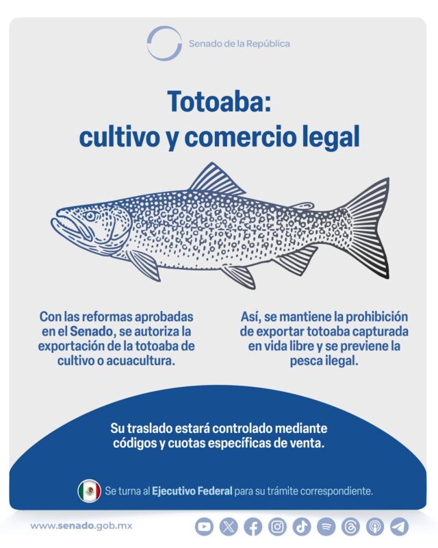 Senado de la RepublicaInfografías El Senado aprobó permitir el aprovechamiento de totoaba proveniente de cultivo o acuacultura, y prohibir la extracción de ejemplares silvestres para su consumo o exportación. Por Araceli Bastida - junio 23, 2025 0 FacebookTwitterPinterestLinkedinReddItEmailWhatsAppTelegramVK