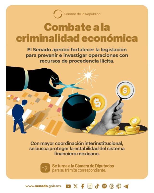 El Senado aprobó reformas a la Ley Federal para la Prevención e Identificación de Operaciones con Recursos de Procedencia Ilícita y al Código Penal Federal, para fortalecer el combate al lavado de dinero y mejorar la detección de operaciones ilegales mediante la colaboración entre instituciones.