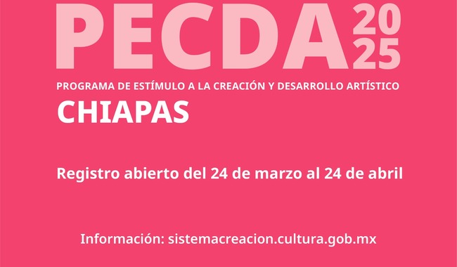 Tuxtla Gutiérrez, Chiapas. – La Secretaría de Cultura del Gobierno de México, a través del Sistema Creación, en colaboración con el Gobierno de Chiapas, a través del Consejo Estatal para las Culturas y las Artes (Coneculta), en un esfuerzo conjunto de recursos y voluntades, emiten la convocatoria del Programa de Estímulo a la Creación y Desarrollo Artístico (PECDA) Chiapas 2025.