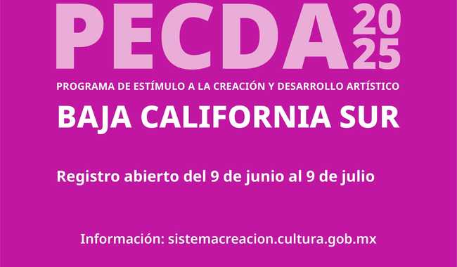 La Secretaría de Cultura del Gobierno de México, a través del Sistema de Apoyos a la Creación y Proyectos Culturales, en colaboración con el Gobierno de Baja California Sur, a través del Instituto Sudcaliforniano de Cultura (ISC), convocan a creadoras, creadores e intérpretes en la entidad a participar en la convocatoria del Programa de Estímulo a la Creación y Desarrollo Artístico (PECDA) Baja California Sur 2025.