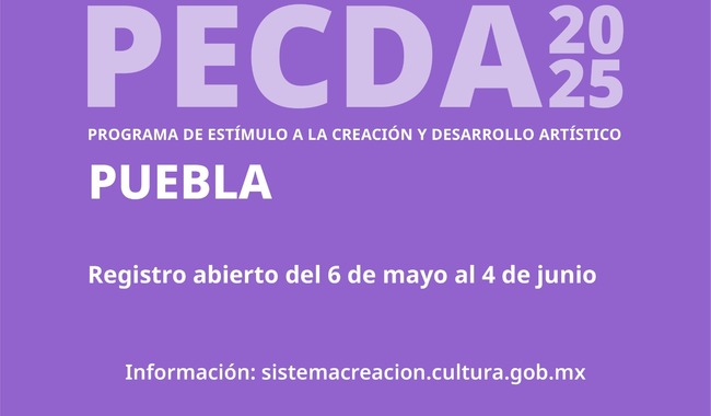 La Secretaría de Cultura del Gobierno de México, a través del Sistema de Apoyos a la Creación y Proyectos Culturales, en colaboración con la Secretaría de Arte y Cultura del Gobierno del Estado de Puebla, convocan a la comunidad artística a participar en la emisión 2025 del Programa de Estímulo a la Creación y Desarrollo Artístico (PECDA).
