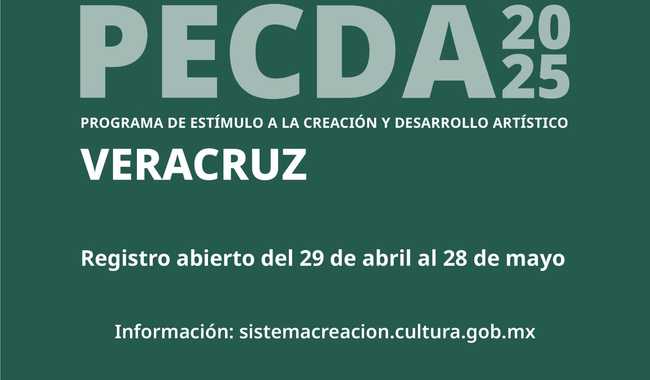 La Secretaría de Cultura del Gobierno de México, a través del Sistema de Apoyos a la Creación y Proyectos Culturales, en coordinación con la Secretaría de Cultura de Veracruz (SECVER), invitan a la comunidad artística del estado a participar en la convocatoria del Programa de Estímulo a la Creación y Desarrollo Artístico de Veracruz, PECDA en su emisión 2025, cuyo propósito es impulsar a la comunidad artística veracruzana mediante acciones que fomenten la creación, la formación y la difusión del arte y la cultura entre los nuevos talentos, así como en creadores jóvenes y de amplia trayectoria y reconocimiento.