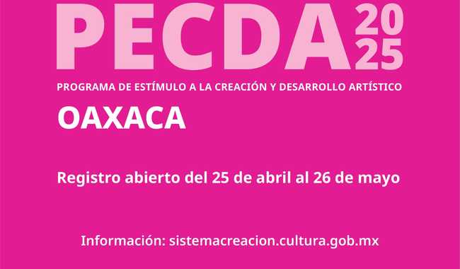 La Secretaría de Cultura del Gobierno Federal, a través del Sistema de Apoyos a la Creación y el Gobierno de Oaxaca, mediante su Secretaría de las Culturas y Artes, emiten la convocatoria 2025 del Programa de Estímulos a la Creación y Desarrollo Artístico (PECDA), con el propósito de impulsar la creación mediante la realización de proyectos artísticos en el estado.