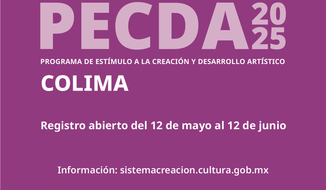 La Secretaría de Cultura del Gobierno de México, a través del Sistema Creación, en coordinación con la Subsecretaría de Cultura del Gobierno de Colima, publican la convocatoria del Programa de Estímulos a la Creación y el Desarrollo Artístico (PECDA) 2025.