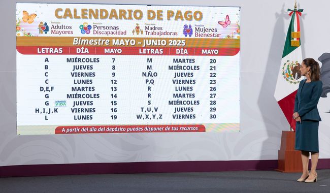 Agregó que del 20 al 30 de mayo, se llevará a cabo la dispersión de las Pensiones y Programas para el Bienestar para las personas cuyo primer apellido inicie con las letras M a la Z.