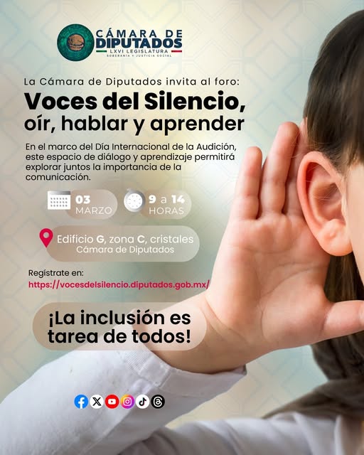Camara de DiputadosInfografías En el Día Internacional de la Audición, la Cámara de Diputados te invita al foro “Voces del Silencio. Oír, hablar y aprender”. Por Araceli Bastida - febrero 26, 2025 0 FacebookTwitterPinterestLinkedinReddItEmailWhatsAppTelegramVK