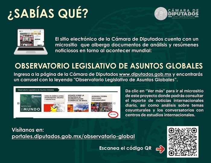 En la Cámara de Diputados contamos con el Observatorio Legislativo de Asuntos Globales. Desarrolla análisis y resúmenes noticiosos en torno al acontecer internacional.