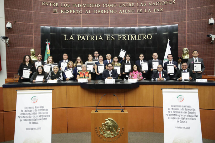 Las senadoras Luisa Cortés García, Susana Harp Iturribarría y María Martina Kantún Can, de Morena, encabezaron la entrega de títulos a la Segunda Generación Nacional de la Especialidad en Derecho Parlamentario y Técnica Legislativa, programa que ofrece la Benemérita Universidad de Oaxaca (BUO) en modalidad a distancia.