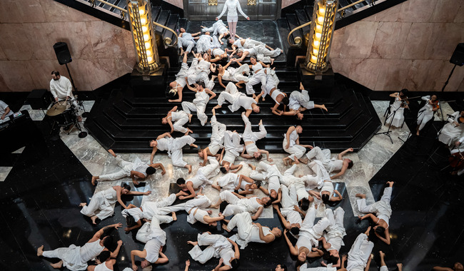 Así, las bailarinas y bailarines vestidos de blanco recorren el vestíbulo del Palacio de Bellas Artes, sus pasillos, las escaleras, la Sala Internacional y el área de murales en diálogo con los espacios y la memoria plagada en sus pilares, pisos, puertas y luces, en la obra de David Alfaro Siqueiros, Rufino Tamayo, Jorge González Camarena, Geles Cabrera, y, por supuesto con el público, que ya sea en el vestíbulo o en el segundo piso, se convierte en otro elemento en movimiento que forma parte de la vida del Palacio y que en plena libertad, al igual que los artistas, puede ir de un espacio a otro, en busca de la mejor vista de la presentación.