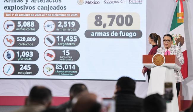 Del 01 de octubre de 2024 a la fecha se han canjeado 8 mil 700 armas de fuego, de las cuales 2 mil 519 eran largas, 5 mil 88 cortas y mil 093 granadas, además de cartuchos y cargadores.