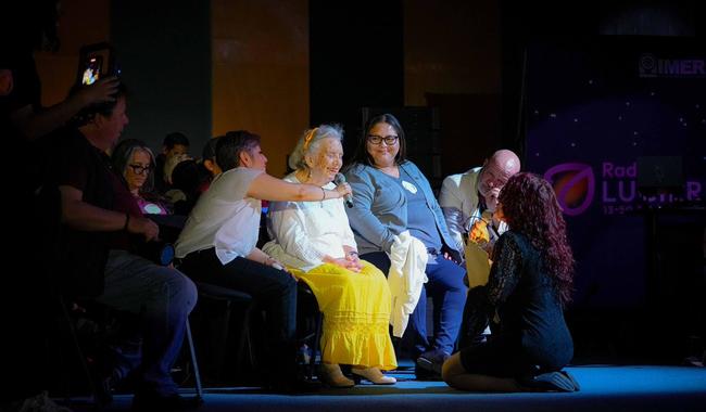 Banderazo de salida programa Luciérnagas 1350AM, presentes la Secretaria de las Mujeres, Citlalli Hernández, Fernando Chamizo, titular del Instituto Mexicano de la Radio y la escritora Elena Poniatowska.