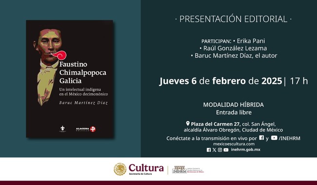 Para conocer la vida y la obra de este personaje, la Secretaría de Cultura del Gobierno de México, a través del Instituto Nacional de Estudios Históricos de las Revoluciones de México (INEHRM), invita a la presentación de la novedad editorial Faustino Chimalpopoca Galicia. Un intelectual indígena en el México decimonónico, de Baruc Martínez Díaz, el jueves 6 de febrero a las 17:00 h en la sede del instituto (Plaza del Carmen 27, San Ángel, 01000, alcaldía Álvaro Obregón).