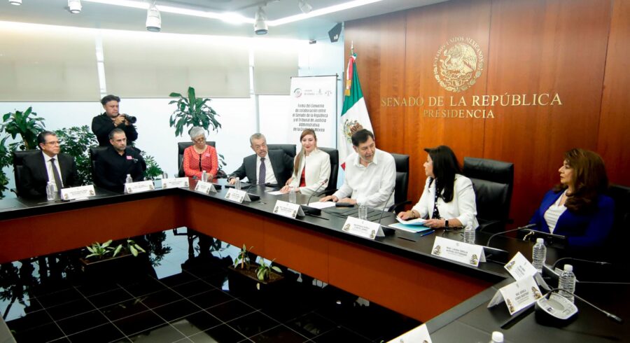 El presidente de la Mesa Directiva, Gerardo Fernández Noroña, encabezó la firma del convenio de colaboración entre el Senado de la República y el Tribunal de Justicia Administrativa de la Ciudad de México, con el objetivo de intercambiar información y que el personal de ambas instituciones reciba capacitación en diversos temas.