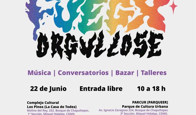 El Complejo Cultural Los Pinos y el Parque de Cultura Urbana (PARCUR), espacios de la Secretaría de Cultura del Gobierno de México, serán sede de “Fuegx Orgullose”, un festival de arte, orgullo y rebeldía que visibiliza y reconoce los derechos, aportes y luchas de las poblaciones LGBTTTIQA+ en un espacio seguro, incluyente y creativo.